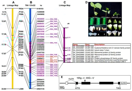 - Jiang, Y.; Ding, M.; Cao, Y.; Yang, F.; Zhang, H.; He, S.; Dai, H.; Hao, H.; Rong, J. Genetic fine mapping and candidate gene analysis of the Gossypium hirsutum Ligon lintless-1 (Li1) mutant on chromosome 22(D). Mol. Genet. Genom. 2015, 290, 2199–2211. [Google Scholar] [CrossRef]