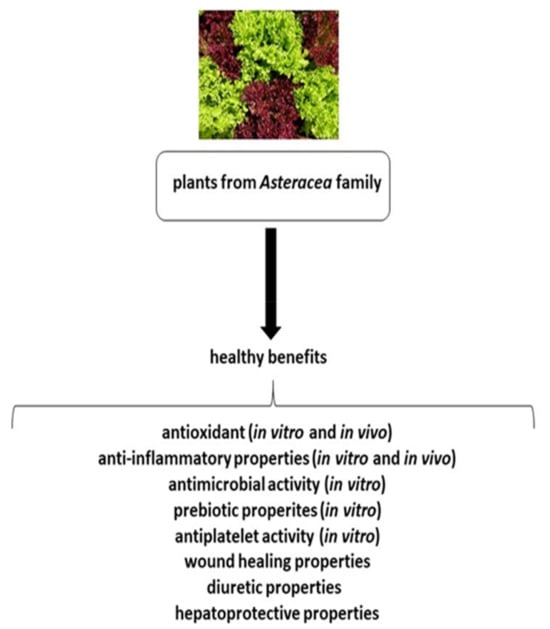 The majority of Asteraceae family members have therapeutic applications, and have a long history in traditional medicine: some members have been cultivated for more than 3000 years for edible and medical purposes. They are most common in arid and semi-arid regions of subtropical areas, but are known and distributed throughout the word. The Asteraceae family members show a wide range of anti-inflammatory, antimicrobial, antioxidant and hepatoprotective activities (Figure 1) []. This paper reviews the current state of up-to-date literature concerning the positive effect of plants, particularly the vegetables, from the Asteraceae family on human health.