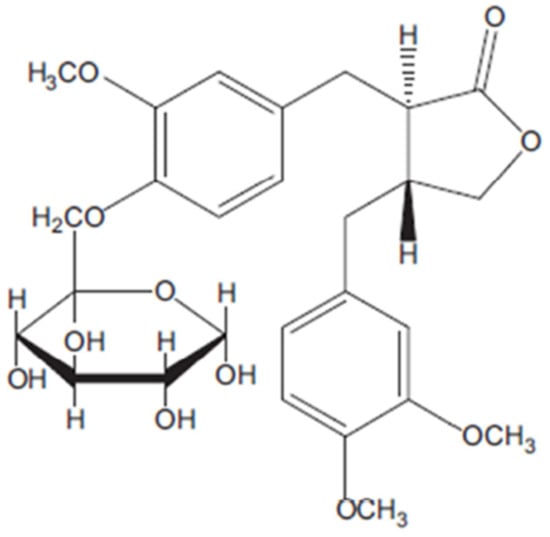 Arctiin is a lignan, a glucoside of artigenin, found in many species of Asteraceae, particularly Centaurea imperialis, Forsythia viridissima and Saussuerea heteromallav and was first isolated from Arctium lappa. Arctiin possesses a number of pharmacological effects including cytotoxicity, antiproliferative and desmutagenic activity; it also acts as a platelet activating factor antagonist and calcium antagonist (Figure 2) [].