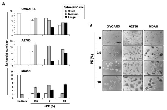 Human platelet releasate (PR) increased spheroid formation in OVCAR5, A2780 and MDAH cells. Cells were cultured on poly-HEMA-coated plates with or without increasing concentrations of PR pools. (A) After 5 days, images were captured using an inverted microscope and spheroids were counted (number of cells/spheroid: 2–5 = small; 6–20 = medium; >20 = large). Data are expressed as mean ± SEM of three replicates with three different PR pools. (B) Representative phase-contrast photomicrographs (original magnification 4×) showing the formation of ovarian cancer (OvCa) cell multicellular tumor spheroids (MCTSs) in the presence of various PR concentrations.
