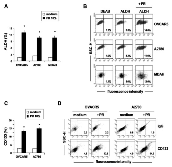 Then, we evaluated the CSC markers ALDH and CD133 by means of flow cytometry in OvCa cells cultured with and without PR (10%) (under non-adherent conditions) and found that PR at 10% v/v significantly increased the percentage of ALDH+ (Figure 2A,B) and CD133+ cells (Figure 2C,D). Representative flow cytometric dot-plots showing ALDH enzymatic activity and CD133 expression by OvCa cells treated or not treated with PR are shown in Figure 2B and Figure 2D, respectively.