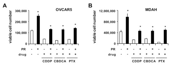 Treatment of OVCAR5 (Figure 3A) and MDAH (Figure 3B) cells with PR significantly increased the number of viable cells (about 2-fold) and partially counteracted growth inhibition by CDDP, CBDCA and PTX in both cell lines (Figure 3A,B).