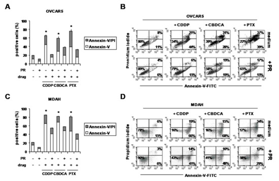 Accordingly, the treatment with PR decreased the pro-apoptotic effects of all drugs (Figure 4). In fact, although drugs increased the percentage of Annexin-V+ (apoptosis) and Annexin-V/PI+ (late apoptosis) in OVCAR5 (Figure 4A,B) and MDAH cells (Figure 4C,D), these effects were partially reduced by PR. Representative flow cytometric dot-plots are shown in Figure 4B,D.