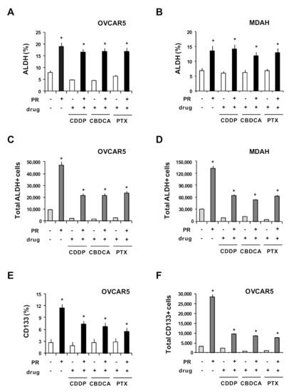 In OvCa, chemotherapy resistance is often associated with high ALDH enzymatic activity [33], a functional regulator [38] and a marker of stemness in many cancer models [39]. ALDH, in combination with CD133, represents a robust marker for OvCa-CSCs [40,41,42]. OvCa-CSCs are thought to contribute to disease recurrence and chemo-resistance; thus, it is challenging to clarify the mechanism leading to their expansion and survival during chemotherapy. We hypothesized that PR could counteract drug activity by allowing the survival of the resistant OvCa-CSCs (ALDH+ and CD133+). We cultured OvCa cells under non-adherent conditions with and without PR for 5 days to generate MCTSs. Then, MCTSs were treated for three more days with a cytotoxic dose of CDDP, CBDCA and PTX ( Table S2). Finally, CD133 expression and ALDH enzymatic activity were evaluated by means of flow cytometry. PR increased the percentage of ALDH+ cells, which was maintained in OVCAR5 (Figure 6A) and MDAH cells (Figure 6B) after treatment with drugs and PR. PR, by increasing the number of viable cells, together with the percentage of ALDH+ cells, also strongly increased the total number of ALDH+ cells in drug-treated OVCAR5 (Figure 6C) and MDAH cells (Figure 6D), with respect to untreated cells. Indeed, ALDHhigh OvCa CSCs display an enhanced ability to form spheroids, generate metastasis and resist apoptosis and drug activity [35,43]. ALDHhigh OvCa CSCs are enriched in residual xenografts after platinum therapy and are 100-fold higher in OvCa cells selected for taxane-resistance in vitro [43]. Accordingly, ALDH expression increases in residual tumors after the first round of chemotherapy, compared to tumors from untreated patients [43].