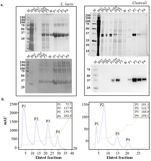 The highest activity of L. lactis protein peaks corresponded to peak 1, although no significant differences were detected between peaks 1 and 2. Moreover, significant differences were obtained between peaks 1 and peaks 3 and 4 (p = 0.0002) (Figure 2b). On the other hand, Clearcoli protein peak 2 was the only one showing activity in this expression system (p = 0.0002). In any case, the activity of each of the L. lactis protein peaks was significantly higher than that of any of the protein peaks obtained from Clearcoli. This observation supports the potential of this expression system as a promising alternative to E. coli for the production of recombinant proteins [27]. These results clearly stressed that the selection of this prokaryotic expression system has a clear impact on the final quality of the produced recombinant protein.