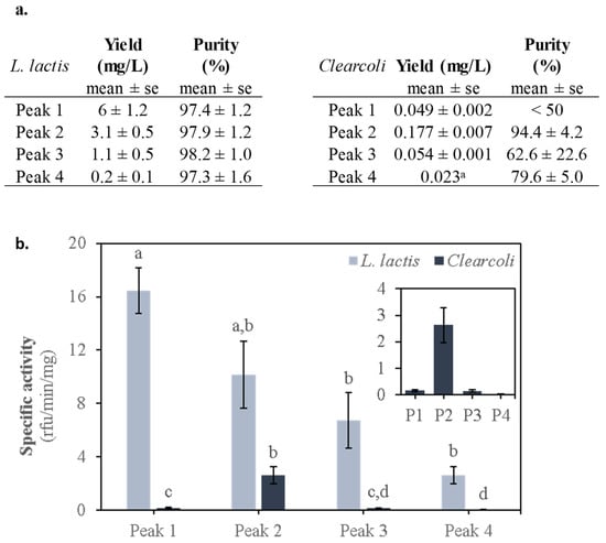 Table summarizing the yields for each peak, as mg of protein per peak per culture L (mg/L), and their purity in % for each expression system. a Peak 4 of Clearcoli was purified in enough amount to be quantified only once out of the 3 separate production experiments performed. Therefore, no SEM is shown (a). Specific activity for the MMP-9 in each peak solubilized from IBs produced by L. lactis and Clearcoli. Relative fluorescence units (rfu) refer to the fluorescence emitted by dye-quenched gelatin along its degradation kinetics due to MMP-9 activity. Specific activity is expressed as rfu per minute per MMP-9 mg (rfu/min/mg). Means and standard error of the mean (SEM) are depicted for each MMP-9 peak (n = 4). Different letters (a to d) depict differences between protein peaks (p = 0.002) (b).