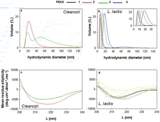 Volume weighted distribution determined by dynamic light scattering (DLS) of MMP-9 peaks from, Clearcoli (a) and L. lactis (b). Far UV-circular dichroism (CD) spectra of MMP-9 peaks from Clearcoli (c) and L. lactis (d). Experimental spectra (dotted lines) and fitted spectra (solid lines). (See Materials and Methods Section 3.8).
