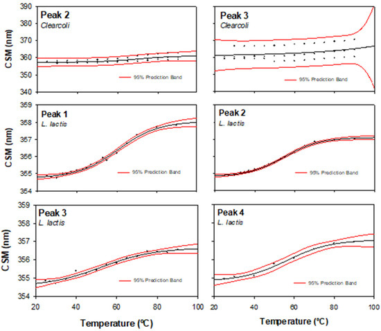 Center of spectral mass of the tryptophan fluorescence spectrum (CSM) versus temperature of each MMP-9 peak (indicated in the plot). The solid line indicated the nonlinear regression to a sigmoidal model; red lines indicated 95% of the prediction interval.