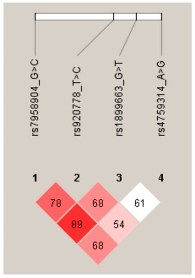 | HOTAIR rs4759314A>G/rs920778T>C/rs7958904G>C | ||||