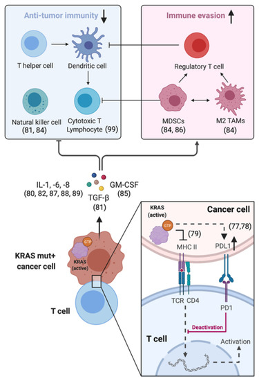 Simplified overview of mutant-KRAS-dependent effects on the surrounding tumor microenvironment via direct cell-to-cell interactions and/or paracrine secretion of interleukins, GM-CSF and TGFβ. These paracrine signals induce the accumulation of myeloid-derived suppressor cells (MDSCs), M2-differentiated tumor-associated macrophages (TAMs) and regulatory T cells, which impair antitumor immunity by suppressing T-cell effector functions. References are displayed in brackets.