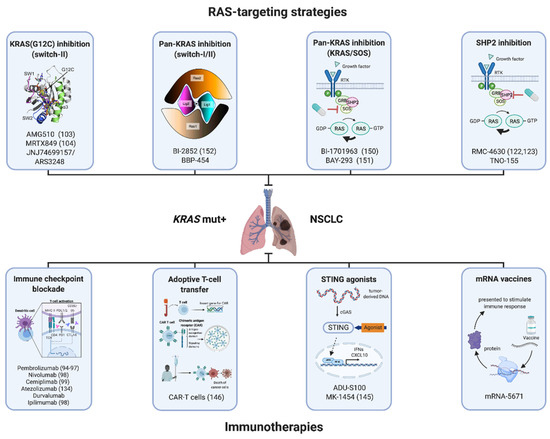 Overview of therapeutic concepts for patients with KRAS-mutant NSCLC in different stages of clinical development that target mutant KRAS itself or the surrounding tumor immune microenvironment. Future clinical trials are required to decipher the optimal strategy of simultaneously or sequentially combining these treatment strategies. References if applicable are displayed in brackets. Created with biorender.com (accessed on 3 March 2021).