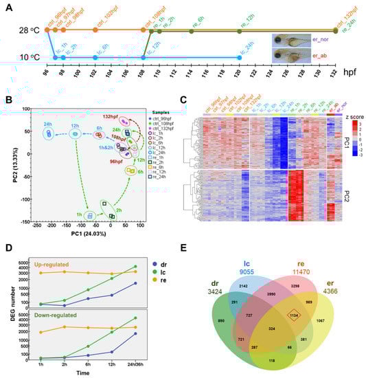 2.2. Transcriptome Landscape of Zebrafish Larvae upon Cold Stress and Rewarming
