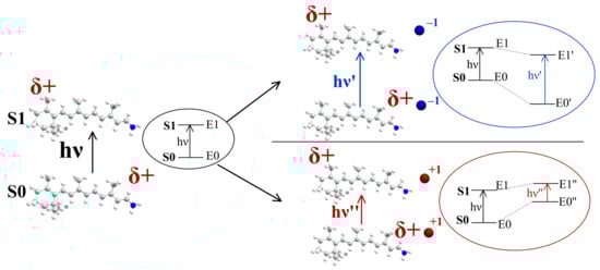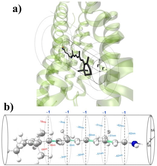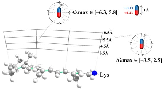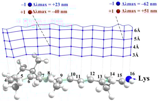 As demonstrated in a number of experimental and computational studies [,,,,], the positive charge located at the NH moiety of the chromophore after excitation partially relocates to the -ionone ring moiety, making the NH part less positive and, accordingly, the -ionone ring part more positive. This difference in the charge distribution between and states leads to different electrostatic interactions of the chromophore with external charges (see Figure 11).