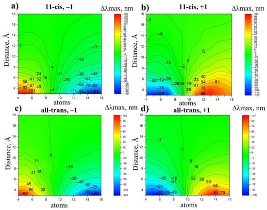 The calculated reference absorption maxima for the 11-cis and all-trans PSB without external charges were found to be 595 nm and 596 nm, respectively. For each chromophore and charge type and position, we performed the SORCI+Q calculation of the absorption maximum value (). Then, we derived the effect of the charged residue placed at a certain position relative to the retinal chromophore as . The results of these calculations are illustrated as 2D functions (reference atom, distance) in Figure 3, Figure S1 and Tables S1–S4.