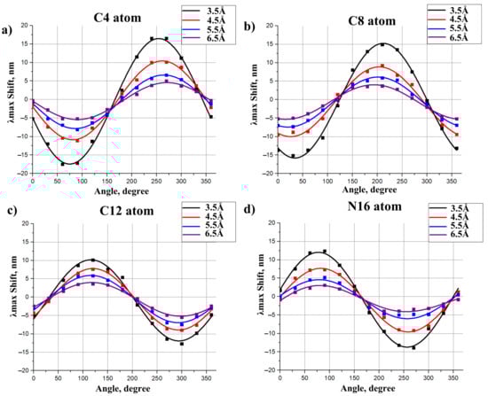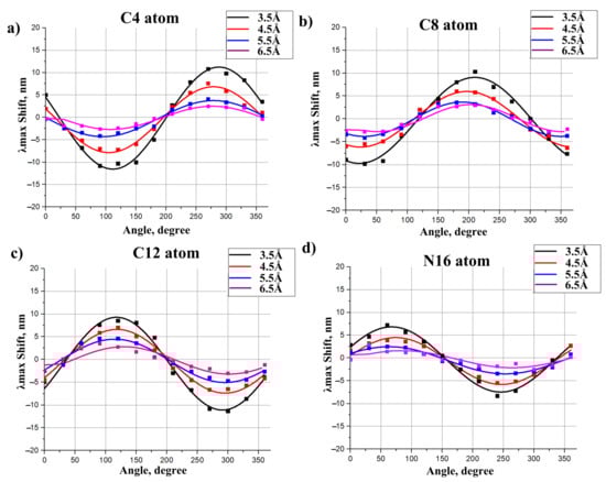 Only the rotation of a dipole moment in the grid plane (Figure 4) was considered. Due to the symmetry of the system, the dipole moment component that is perpendicular to the grid surface should have a negligible effect on . To prove this, we located the dipole moment at 3.5 Å from the N16 PSB atom and rotated it perpendicular to the grid surface; values were calculated with a step of 30. The calculated spectral shift values did not exceed 1.5 nm, which is within the limits of QM calculation error.