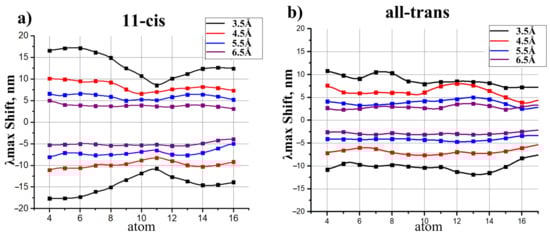 The effect of polar residues on is slightly larger for 11-cis PSB than for all-trans PSB. This fact can be rationalized by the difference in the portion of positive charge translocated from the NH region to the beta-ionone ring region upon photoexcitation, as discussed in the Section 2.2.