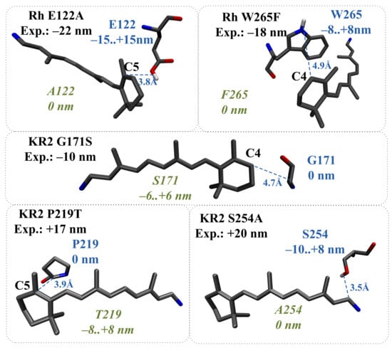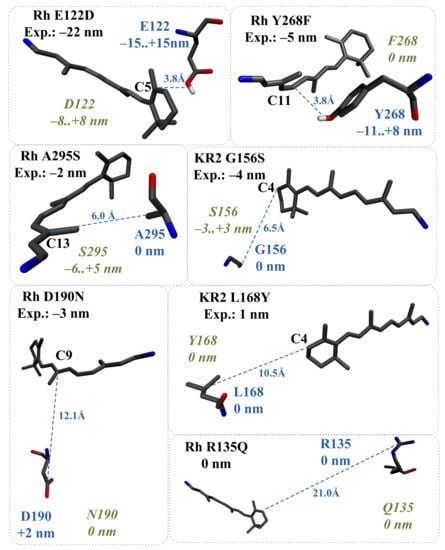 Bovine rhodopsin (Rh) and sodium pumping rhodopsin (KR2) mutants, for which the direct effect of amino acid substitution cannot completely explain the experimentally observed spectral shift. Experimental spectral shifts are shown in black. The distances from the wild-type residues to the PSB and corresponding contributions to are shown in blue. The evaluated contributions of new residues to are shown in green. The distances are given in Å.