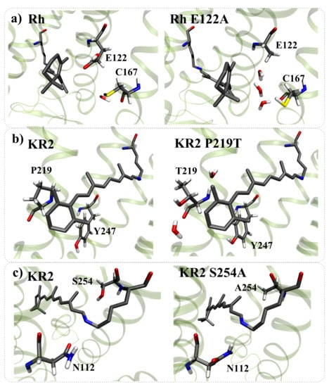 Structural reorganization caused by amino acid replacements. (a) E122A substitution in bovine rhodopsin (Rh); (b) P219T substitution in sodium pumping rhodopsin (KR2); (c) S254A substitution in sodium pumping rhodopsin (KR2).