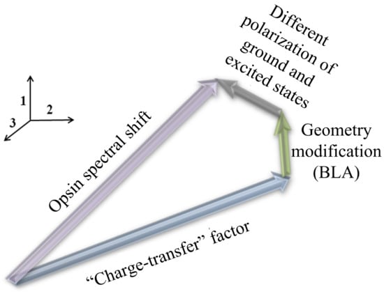 The tuning of the rhodopsins’ first spectral band has been widely investigated [,,,,]. Two factors are found to be the most important: the steric and electrostatic interactions of PSBs with surrounding amino acids of the opsin. Several other factors, such as the polarization of the retinal environment or inter-residual charge transfer within the binding pocket, have also been studied but were found to be less significant [,].