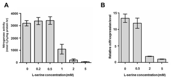 In this study, the effects of L-serine on growth and nitrogen fixation of P. polymyxa WLY78 were studied. We found that L-serine can be used as the sole nitrogen source for the growth of P. polymyxa WLY78. This bacterium grew well in the presence of 10 mM L-serine, but the best growth was observed in the presence of 2 mM L-serine, which indicated that too much L-serine inhibited growth. A previous study showed that L-serine would inhibit the growth of E. coli cells cultured in minimal medium with some certain carbohydrate as the sole carbon source including glucose by inhibiting homoserine dehydrogenase []. In B. subtilis, over 1 mM of serine inhibits the growth of cells cultured in minimal medium, while the addition of serine to LB medium does not show any inhibition. Moreover, the addition of threonine partially overcomes serine toxicity, suggesting that the serine toxicity is due to the repression of threonine biosynthesis []. It might be the same situation in P. polymyxa WLY78.