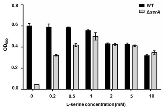 Here, the serA deletion mutant (ΔserA) of P. polymyxa WLY78 was constructed. In the minimal medium without serine, P. polymyxa WLY78 grew well, but the ΔserA mutant nearly could not grow. The ΔserA mutant grew well with the addition of serine in medium and grew best when serine concentration was 1 mM. The data suggested that serA is essential for bacterial growth in the absence of serine (Figure 3). The growth of both the ΔserA mutant and P. polymyxa WLY78 decreased as serine concentration was more than 1 mM.