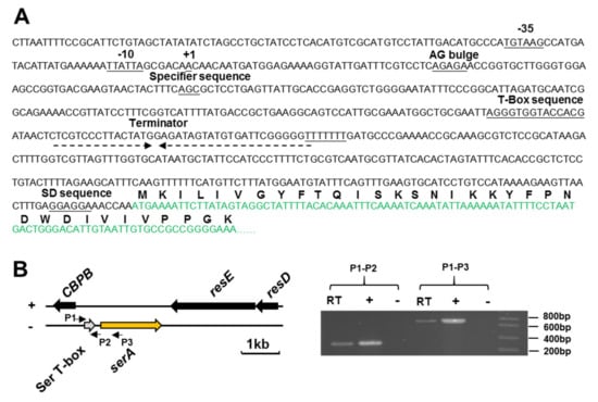 Here, the transcription start site (TSS) of the serA gene of P. polymyxa WLY78 was determined by using the 5′-RACE (Rapid Amplification of cDNA Ends) method. The TSS of the serA gene is located at −508 bp upstream of the translational start site (ATG). A putative promoter (−35 region and −10 region) was identified in front of the TSS (Figure 4A). The data suggested that the mRNA leader region is 508 bp in length. The Ser T-box riboswitch is 280 bp in length from +1 (TSS) to +280 (end of a string of U residues behind the terminator). The conserved motifs: AG bulge, T-box sequence, and rho-independent transcriptional terminator (inverted repeat sequence followed by a string of U residues in the RNA sequence), were identified in the Ser T-box riboswitch.