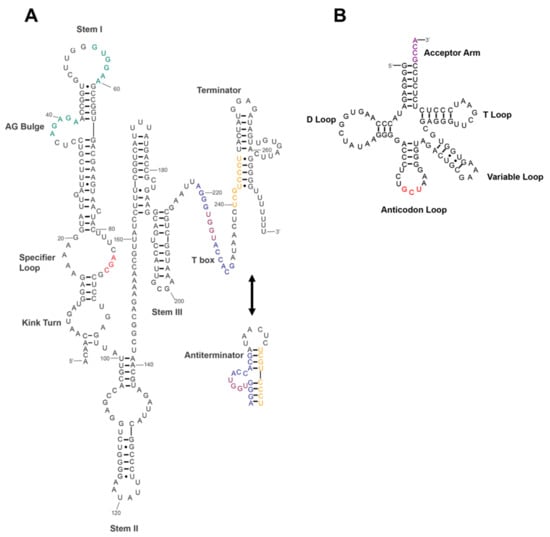 - Kreuzer, K.D.; Henkin, T.M. The T-Box Riboswitch: tRNA as an effector to modulate gene regulation. Microbiol. Spectr. 2018, 6. [Google Scholar] [CrossRef]