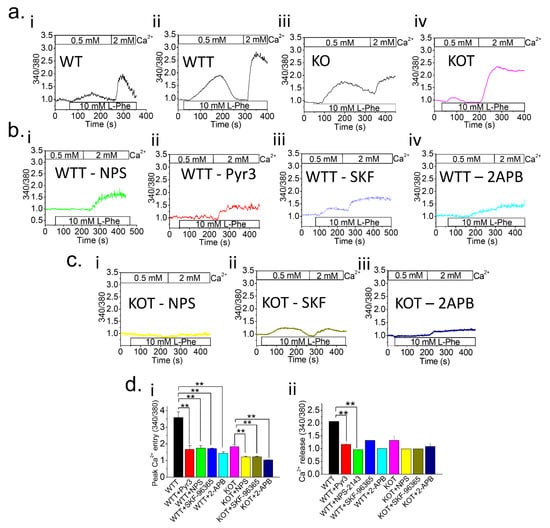 To delineate the Ca2+ entry pathway in both WTT and KOT PT cells, we tested several inhibitors: NPS-2143 (for CaSR), Pyr3 (for TRPC3), SKF-96365 (for TRP channel), and 2-Aminoethoxydiphenyl borate (2-APB; for inositol triphosphate (IP3) receptor) [20, 21, 22, 23]. In the presence of NPS-2143, Ca2+ release in both WTT and KOT PT cells was completely inhibited (Figure 1b,d), while the Ca2+ entry of KOT cells was completely inhibited, unlike that of the WTT cells. In turn, application of Pyr3 on WTT cells had a similar inhibitory effect on Ca2+ release and Ca2+ entry (Figure 1b,d), confirming the involvement of TRPC3 in both Ca2+ entry and release. Inhibition by SKF-96365 was prominent in both WTT and KOT after L-Phe induction for Ca2+ release and Ca2+ entry (Figure 1b,d). It is worth noting that SKF-96365 is also known to inhibit the SOCE pathway, which can attribute to possible indirect effects [24]. Interestingly, IP3 receptor inhibition by 2-APB has considerably decreased both Ca2+ release and entry in WTT and KOT cells (Figure 1b,d).
