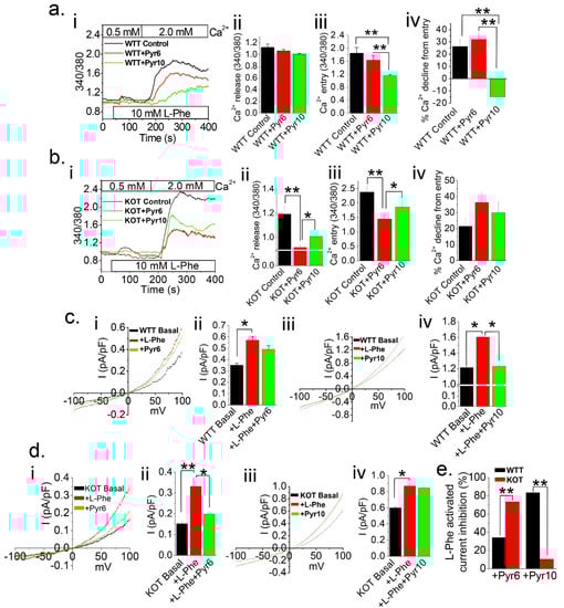 Ca2+ entry pathway in PT cells is contingent upon presence of TRPC3 in higher PT luminal pH conditions. Ratiometric [Ca2+]i measurements were performed and plotted on Fura-2 loaded PT cells from Acz treated mice (a) WT (WTT) and (b) KO (KOT) PT cells with no inhibitors (WTT Control or KOT Control), Pyr6 (3 μM), or Pyr10 (3 μM). Prior to experiments, PT cells were placed in a 0.5 mM Ca2+ bath and L-Phenylalanine (L-Phe; 10 mM) was applied. Subsequently, 2 mM Ca2+ was applied to replenish [Ca2+]o. (aii,bii) Peak Ca2+ release, (aiii,biii) Peak Ca2+ entry, and (aiv) Percent Ca2+ decline from entry were quantified into bar diagrams in means ± SEM. (c,d) Single cell patch clamp voltage sweeps from −100 to +100 mV were performed on WTT or KOT PT cell. L-Phe (10 mM) was applied to induce current and (ci,cii,di,dii) Pyr6 (3 μM) or (ciii,civ,diii,div) Pyr10 (3 μM) was applied as a current blocker. (cii,civ,dii,div,e) Average current density at +100 mV and L-Phe activated current inhibition percentage were quantitated into means ± SEM, respectively. Experiments were performed four times. *, p < 0.05; **, p < 0.01.