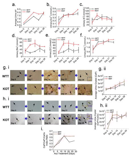 Higher luminal pH induced by Acz treatment induces CaP crystals formation. Representative line graphs of (a) Urine pH, urine electrolyte excretion levels (b) Ca2+, (c) K+, (d) Na+, (e) Cl− and (f) PO43−, collected on day 0, 7, 14, 21 and 28 of the treatment periods immediately after 24 h urine collection. (a,b) and (d–f) Urinary pH, Ca2+, Na+, Cl− and PO43− clearance progressively increased throughout the treatment period, particularly for the KOT group. (c) Urine K+ on the other hand showed a reduction in clearance for both the untreated and treated groups throughout the treatment period. All urine measurements were normalized by creatinine. (gi) Alizarin Red (AR) pH 4.3 (stains CaP crystals) and (hi) pH 6.8 (stains both CaOx and CaP+CaOx crystals) to differentially visualize calcium crystals present in the urine. Black arrows show urine crystals (CaP and CaP+CaOx). (gii,hii) representative line graphs for both WTT and KOT groups showing progressive increase in CaP and CaP+CaOx urine crystals respectively following Acz treatment. (i) CaP to CaP/CaOx index ratios throughout Acz treatment period which compared WTT and KOT mice groups were quantitated into means ± SEM. Experiments performed n = 4 times.