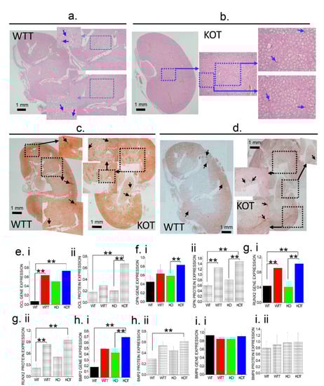 Histological and molecular characterization of kidney calcification and stone formation following Acz treatment. Evidence of kidney calcification and stone formation by examining kidney tissues and its underlying molecular analysis through gene/protein expression of calcification markers. (a,b) Representative Von Kossa staining (for CaP) of whole kidney sections of WTT and KOT showing calcified regions of the kidney indicated by blue arrows. (c) Alizarin Red (AR) staining of whole WTT and KOT kidney sagittal sections of AR pH 4.3 staining shows CaP stones present in the LOH region of whole kidney while (d) AR pH 6.8 shows CaP+CaOx (mixed) stones in the calyx region of WTT and KOT whole kidney. Gene/Protein expression analysis providing evidence PT cell calcification in treated mice are shown by expression profiles of known calcification markers; (ei,eii) OCL, (fi,fii) OPN, (gi,gii) RUNX2 and (hi,hii) BMP2, which are significantly higher for the treated groups especially for KOT compared to the controls (WT and KO), except for (ii,iii) BMP6 which did not show any significant difference between the treated and untreated groups. (e–i) Bar graphs quantifications are means ± SEM, (n = 3); **, p < 0.01. All gene and protein expressions are normalized to GAPDH and β-actin respectively.