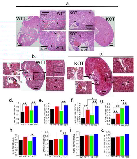 Histological and molecular characterization of kidneys for fibrosis and inflammation following Acz treatment. Supportive evidence of Acz-induced fibrotic and inflammatory induction with of expressions of genetic markers of fibrosis and inflammation in PT cells. (a) Representative H&E staining of KOT and WTT mice kidney sections showing regions of inflammation in the kidney. (b,c) WTT and KOT mice kidney sections of Masson’s Trichrome staining shows fibrotic regions of the kidney. Corroborative evidence through gene expression analysis for fibrotic and inflammatory markers (d) NFκβ, (e) MCP1, and (f) NLRP3 in WT, WTT, KO, and KOT mice PT cells which are significantly higher in the treated groups especially for KOT, compared to the controls. Genetic expression profiles of (g) IL-6, (h) 1L-1β, (i) SMα, (j) TGFβ and (k) FN-1 in WT, WTT, KO, KOT mice PT cells; except in TGFβ and FN-1, KOT groups yielded higher expressions. (d–k) Bar graphs are means ± SEM from three separate experiments. *, p < 0.05; **, p < 0.01. All gene expressions are normalized to GAPDH.