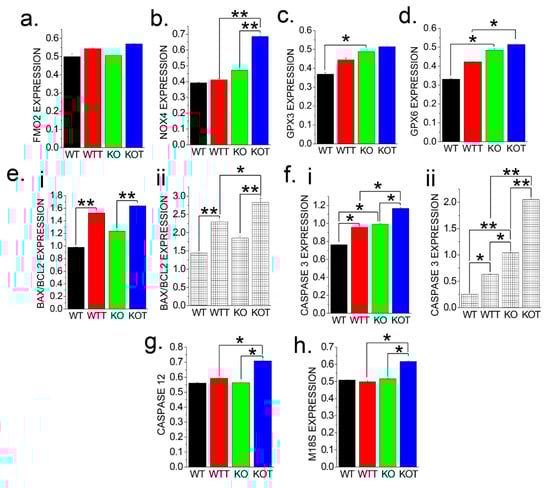 PT cells are sensitive to reactive oxygen species (ROS) [33], which can be accumulated during PT acidosis during Acz treatment [34,35]. Therefore, we examined the expressions of oxidative stress marker genes, FMO2 and NOX4 (Figure 7a,b) as well as oxidative protection marker genes, Glutathione peroxidases (GPX) 3 and 6 (Figure 7c,d) in PT cells from untreated (WT and KO) and Acz treated (WTT and KOT) mice. Among the oxidative stress marker genes tested, NOX4 expression was shown to be significantly increased in KOT groups compared to all other groups (Figure 7b). Oxidative protection marker genes (GPX3 and GPX6) exhibited an increased expression amongst all the treated groups (WTT and KOT). However, it is worth noting that the rise in oxidative protective markers could be an action by PT cells to offset the rise in ROS production by adjusting ROS to homeostatic levels. Recent studies have shown that ROS and the resulting oxidative stress play a pivotal role in apoptosis [36,37]. Cell death through apoptosis is usually due to response to changes in the cellular microenvironment such as extra and intracellular pH, which can disrupt cellular functions leading to cell death [38]. Therefore, following Acz treatment, we examined the expressions of apoptotic genes, BAX1, BCL2, Caspase 3 and Caspase 12 (Figure 7e–g) in PT cells. We found that the treated groups, particularly the KOT group, have shown a significant increase in caspase gene expression (Figure 7f,g) while BAX/BCL2 expressions was higher in both WTT and KOT (Figure 7e). We confirmed our results by further protein analysis of the same apoptotic markers (Figure 7e,f) which were also consistent (Figure 7(eii,fii)). In addition, previous studies have shown endoplasmic reticulum (ER)-stress induced apoptosis is dependent on Caspase 3 activation and independent of Caspase 12 [39, 40, 41]. Therefore, expression levels of ER-stress gene, M18S was assessed (Figure 7h). We found that M18S levels was significantly increased in the KOT group while all other groups did not show any significant difference, providing support for possible ER-stress induced apoptosis after Acz treatment in absence of TRPC3. Together, these results support the idea that intracellular acidosis in PT cells, coupled with TRPC3 ablation, can aggravate oxidative stress leading to renal injury and inflammation. All of these are detrimental conditions leading to PT cell death that can form cellular debris and work towards the growth and aggregation of calcium crystals [42].