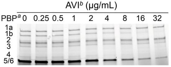 P. aeruginosa PAO1 cultures grown to the midexponential phase (7.6 log10 CFU/mL) were preincubated in cation-adjusted Mueller–Hinton broth (CAMHB) at 37 °C (180 rpm) for 20 min. Afterwards, 4 µg/mL of avibactam (AVI) was added, and the bacterial cultures were incubated (37 °C, 180 rpm). Control and treatment samples were taken after 15, 30 and 60 min incubation, kept in ice and centrifuged (3220× g for 10 min at 4 °C). The bacterial pellets were washed in 30 mL phosphate-buffered saline (PBS) (pH 7.5) four times, resuspended in 10 mL of PBS and sonicated by using a Digital Sonifier Unit model S-450D (Branson Ultrasonics Corp., Danbury, CT, USA) at 40% amplitude for three 2 min bursts (while immersed in an ice bath) and centrifuged at 3220× g for 15 min at 4 °C. Membranes containing the PBPs were isolated by ultracentrifugation at 150,000× g for 30 min at 4 °C using an Optima L100XP Ultra centrifuge (Beckman Coulter, Inc., Palo Alto, CA, USA) and were resuspended in 60 μL of PBS. Total protein content was measured using the Quick Start Bradford protein assay kit with bovine serum albumin as a standard (Bio-Rad Laboratories, Hercules, CA, USA), according to the manufacturer’s instructions. To determine the PBP fraction unbound, membranes containing PBPs (20 μL, at 0.5 mg/mL) were labeled with a 25 μM concentration of the fluorescent penicillin bocillin FL []. Labeled PBPs were denatured and separated through 4–15% SDS–polyacrylamide gel electrophoresis (Bio-Rad Laboratories, Hercules, CA, USA). Labeled PBPs were visualized using a Typhoon FLA 9500 biomolecular imager (GE Healthcare Bio-Sciences AB, Uppsala, Sweden) (excitation at 488 nm and emission at 530 nm), and binding to different PBPs was determined from at least three independent experiments using ImageQuant TL software v8.1.0.0 (GE Healthcare Bio-Sciences AB, Uppsala, Sweden).