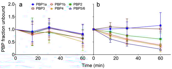 3.2. Intact Cells’ Time-Course of PBP-Binding Assay