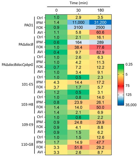 Table 2 shows the basal ampC mRNA expression levels for each of the strains studied relative to wild-type strain PAO1. As previously demonstrated by our group and other independent researchers, PBP4 inactivation (PAΔdacB) elicited significant ampC hyperexpression; the highest relative expression values were observed at the 180 min determination (1100 ± 243). Both initial ST175 isolates, 101-E5 and 109-E9 (wild-type AmpC), and their CAZ/AVI post-therapy resistant isolates, 103-H8 and 110-G8, showed an even more extensive ampC relative expression (2400 ± 1100, 1700 ± 382, 5400 ± 2900 and 3500 ± 1600, respectively) consistent with the ampR-G154R-resulting enhanced ampC expression observed in nearly all of the ST175 isolates [,,]. Inactivation of the three low-molecular-weight (LMW) PBPs (PBP4, 5/6 and 7) in PAΔdacBdacCpbpG elicited the most remarkable cephalosporinase constitutive overexpression (58,000 ± 26,000) after 180 min.
