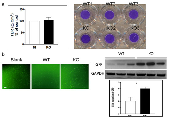To examine the effect of CAR deletion, isolated wild-type (WT) endothelial cells and endothelial cells from mice in which CAR had been deleted from the endothelial cells (CAR-eKO) (KO) were cultured in the upper chamber and HeLa cells were cultured in the bottom chamber of a trans-well plate (Nunc Co., UK). Green fluorescent protein-Coxsackievirus B3 (GFP-CVB3) [24] was added to the upper chamber and the plate was incubated for 18 h. Trans-epithelial resistance (TER) was measured to assess the transcellular permeability of endothelial cells; after TER measurement, the endothelial cells in the upper chamber were stained with crystal violet to assess cell density. TER was similar in WT and KO endothelial cells. There were no electrical resistance changes in endothelial cells due to CAR deletion, and crystal violet staining confirmed a similar cell density of WT and KO endothelial cells (Figure 1a). However, the GFP expression of bottom well HeLa cells was significantly increased in the CAR deleted endothelial cell cultured chamber compared to the WT endothelial cell cultured chamber, suggesting that the permeability of GFP-CVB3 was significantly increased in the CAR deleted endothelial cells, blank indicated no endothelial cell cultured chamber (Figure 1b). These results strongly imply that CAR deletion is closely related to vascular permeability for CVB3.