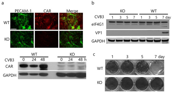 CAR expression and CVB3 infection were confirmed in cultured hepatic endothelial cells. Cell shape and culture patterning of CAR-deleted endothelial cells was not significantly different to WT endothelial cells. The KO cells did not form endothelial tubes and showed weak platelet endothelial cell adhesion molecule-1 (PECAM-1) expression (Figure 2a). In the endothelial cells, CVB3 replication was very slow. The seven days after CVB3 infection, viral capsid protein VP1 and progeny viruses were detected in WT endothelial cells but not in KO endothelial cells (Figure 2b,c). While WT-endothelial cells can be infected with CVB3, the infection occurs more slowly than in HeLa cells where there is usually robust replication and cell lysis by 24–48 h. Given this finding, the increase in passage of CVB3 in the trans-well chambers mentioned above indicate that the increase in CVB3 in the trans-well chambers that had CAR-eKO endothelial cells was most likely related to increased permeability of the endothelial cells to CVB3.