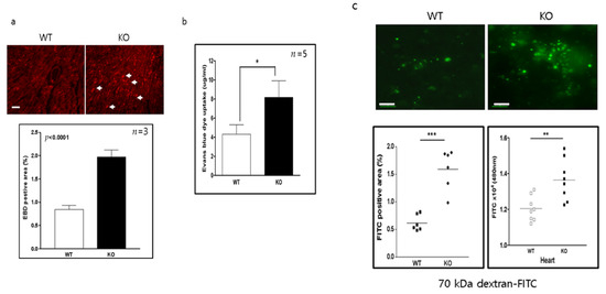 Evans blue dye (EBD) is used in some situations as a marker of vascular permeability. KO mice were assayed for vascular permeability by measuring the amount of Evans blue dye (EBD) uptake into the heart. Sixty minutes later the heart was removed, and the area and extent of EBD uptake was quantified (expressed as % of total). The EBD uptake was significantly increased in KO mice compared to WT mice (WT vs. KO, 0.9 ± 0.1 vs. 2 ± 0.1, respectively; p < 0.0001) (Figure 3a). The concentration of EBD was also significantly increased in the heart of KO mice (WT vs. KO, 4.1 ± 1.1 vs. 8 ± 1.6 μg/mL, p < 0.05) (Figure 3b). However, the EBD molecules were smaller than those of conventional biomaterials such as albumin, immunoglobulin, and viruses. To examine the vascular permeability of a larger substance, 75-kDa dextran (Dextran-FITC) was delivered through the tail vein, and its uptake levels in the heart were measured. The area of Dextran-FITC was significantly increased in the hearts of KO mice (WT vs. KO, 0.6 ± 0.2 vs. 1.59 ± 0.18 µg/mL, p < 0.001). The level of dextran-FITC was also significantly higher in heart extracts from KO mice than in those of WT mice (WT vs. KO, 1.2 ± 0.2 vs. 1.39 ± 0.16; p <0.01) (Figure 3c). These data indicate that endothelial CAR deletion increases vascular permeability in the heart.
