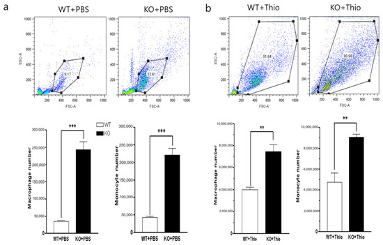 Peritoneal cavity immune cell infiltration was measured by FACs analysis to compare WT and KO mice. Mice were sacrificed by CO2 gas, then 10 mL 1X PBS was injected into peritoneal cavity to wash out immune cells; collected cells were stained by anti-CD11b-PE (Macrophage) and anti-Gr1-FITC (monocyte) antibody (R&D biosystems, Minneapolis, MN, USA).