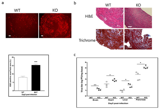 To examine the effect of endothelial CAR deletion on myocarditis, WT and CAR-eKO mice were infected with CVB3. Five days after infection, heart, liver, pancreas, and brain were harvested to assess histology and extent of virus proliferation within the tissue. In Figure 5a, EBD uptake into the damaged myocardium by CVB3 was significantly higher in CAR-eKO than in WT mice (WT vs. KO, 8.2 ± 0.5 vs. 15.1 ± 0.6; p < 0.001). Heart inflammation and fibrosis were not significantly increased in CAR-eKO mouse hearts at 5 days post infection (Figure 5b). Virus replication in each tissue was confirmed by plaque forming unit (PFU) assay; tissue virus titer dramatically increased in KO mice compared with WT mice (Figure 5c). Interestingly, the virus was also detected in the brain of KO mice. Therefore, the endothelial cell CAR might be related to normal function of the blood–brain barrier (BBB) and block virus penetration from blood vessels into the brain.
