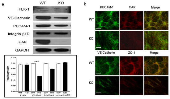 We observed CAR and endothelial cell-to-cell junctional protein expression level; protein was extracted from both WT and KO endothelial cells. Immunoblot analysis used an ECL detection system as described previously [24]. Primary antibodies were used; anti-CAR (Santa Cruz Biotechnologies, Dallas, TX, USA), PECAM-1, VE-cadherin (R&D system, Minneapolis, MN, USA), FLK-1 (Sigma-Aldrich, Inc. St. Louis, MO, USA), integrin-β1D (Zymed Laboratories, Inc. South San Francisco, CA, USA), and GAPDH (Santa Cruz Biotechnologies, Dallas, TX, USA). Protein expression levels were evaluated with Image Lab software (Bio-Rad laboratories, Hercules, CA, USA) based on the signal intensity of each protein using GAPDH as an internal control for protein loading.