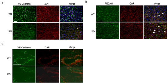 Disruption of the endothelial cell VE-cadherin and PECAM-1 expression by CAR ablation. (a). WT and KO mice liver were subjected to immunofluorescence staining using the indicated antibodies. Green, VE-cadherin and red, ZO-1. (b). Green, PECAM-1 and red, CAR in the vascular endothelial cells of liver, which are indicated by white arrows (scale bar, 40 µm and 15 µm). (c). WT and KO mouse hearts coronary vessel were subjected to immunofluorescence staining using the indicated antibodies. Green, VE-cadherin and red, CAR (scale bar, 15 µm).