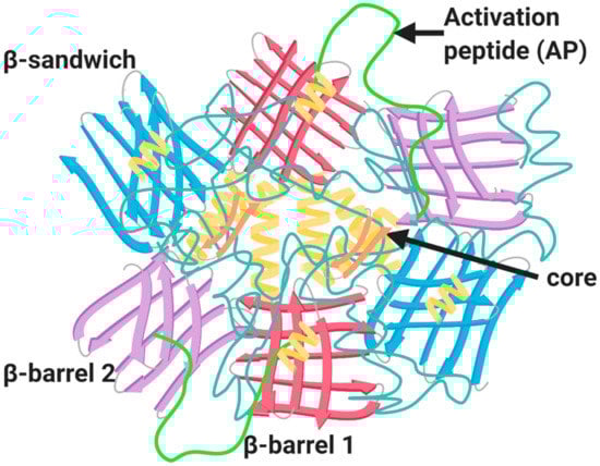 - Yee, V.C.; Pedersen, L.C.; Le Trong, I.; Bishop, P.D.; Stenkamp, R.E.; Teller, D.C. Three-dimensional structure of a transglutaminase: Human blood coagulation Factor XIII. Proc. Natl. Acad. Sci. USA 1994, 91, 7296–7300. [Google Scholar] [CrossRef]