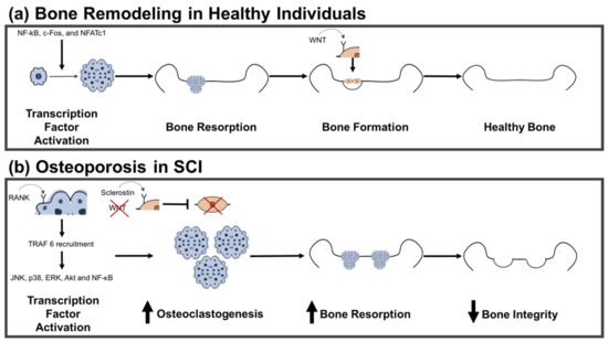 Typical bone remodeling vs. bone remodeling in individuals with spinal cord injury (SCI). (a) In individuals without SCI, bone remodeling is typically a balanced process. Transcription factors nuclear factor-κB (NF-kB), c-Fos, and nuclear factor of activated T-cells, cytoplasmic 1 (NFATc1) secreted by osteoblasts are activated, stimulating the maturation of mononucleated osteoclast progenitors. Mature osteoclasts secrete cathepsin K and hydrochloric acid (HCl) to dissolve the bone matrix, with resulting calcium resorption. Moreover, Wnt protein can bind to receptors on osteoblasts. Upon activation, osteoblasts form a layer across the surface of the dissolved bone for calcification. When these processes are coupled, bone integrity is preserved. (b) In individuals with SCI, bone remodeling is no longer balanced, resulting in osteoporosis. Receptor activator of nuclear factor-κB (RANK) ligand binds to RANK receptors on osteoclasts, inducing TNF receptor-associated factor 6 (TRAF-6) recruitment and activation of transcription factors c-Jun N-terminal kinase (JNK), p38, extracellular signal-regulated kinase (ERK), alpha serine-threonine protein kinase (Akt) and NF-κB. These factors participate in various cellular signaling pathways to induce osteoclastogenesis. Furthermore, Wnt protein may be unable to bind due to the presence of Wnt-receptor competitive inhibitors (e.g., sclerostin (SOST)), preventing osteoblast activation. Therefore, increased bone resorption occurs without osteoblast-mediated bone construction. Bone integrity is compromised with resulting osteoporosis.