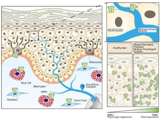 A study reported TRPA1 over-expression in the epidermis of patients with bullous pemphigoid, a rare autoantibody-mediated blistering disease characterized by intense pruritus, compared to healthy skin, but channel expression did not significantly correlate, neither with eosinophil dermal infiltration nor with the severity of pruritus [125] (Figure 1).