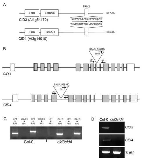 Generation of the double cid3cid4 mutant. (A) Schematic presentation of protein models for CID3 and CID4. Position of Lsm, LsmAD, and PAM2 is display. The PAM2 sequence is identical, showing the tandem reiteration of the PAM2 sequence found in these two proteins. (B) Schematic presentation of gene models for CID3 and CID4. Exons are represented by rectangles and introns by lines; gray rectangles denote coding sequences. Triangles point location of the SALK T-DNA insertions in CID3 and CID4. Arrowheads indicate the position and orientation of the oligonucleotide primers used in genotyping, LBb1.3 is specific to the left border of the T-DNA, LP1, and RP1 are gene specific primers for each of the two genes. (C) PCR amplification products obtained from genomic DNA extracted from the wild type Col-0 and the cid3cid4 double mutant were resolved in 1.5% (w/v) agarose gels; they confirm the homozygous T-DNA insertion at both loci. Amplifications products were only obtained in Col-0 DNA (CID3, 430bp, and CID4, 580bp), and T-DNA products only on cid3cid4 DNA. (D) Expression analysis of CID3 and CID4 by RT-PCR in wild-type and cid3cid4 mutant lines. Amplification products were fractionated into a 1.5% (w/v) agarose gels; tubulin TUB2 genes was used as constitutive control.