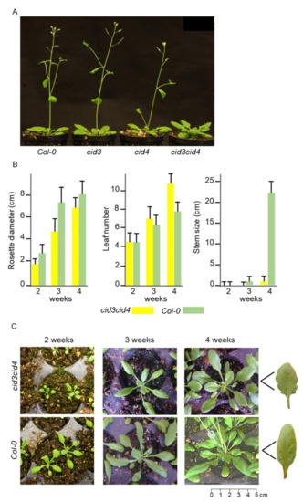 Comparison of the Col-0 and cid3cid4 lines. (A) Flowering time phenotype, a delay in flowering occurs in the double cid3cid4 mutant. (B) Comparison of rosette diameter, number of leaves, and stem size during growth on standard condition; mean values of 20 plants are displayed. (C) Comparison of rosettes of the experiment in (B) is displayed; a 5cm scale is shown. Representative rosette leaves from adult cid3cid4 and Col-0 plants are shown to the right of the 4 weeks panel. Plants were grown as described in Materials and Methods.
