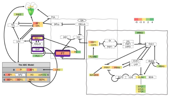 Schematic representation of gene networks regulating flowering time showing differentially expressed genes in cid3cid4. Gene regulatory networks are based on previously reported work [36,37,38,39,40,41]. Black arrows and blunt head arrows indicate positive or negative effects, respectively, in the pathway. Differentially expressed genes between the cid3cid4 mutant and wild-type Col-0 are displayed in rectangles divided in two zones, each one of them in a green–yellow–red scale, upregulated genes are highlighted in green shades, and downregulated genes are highlighted in red shades. The left zone includes the values of 2 weeks-old plants, and the right zone the plants at bolting. Genes within the dotted rectangles did not show differential expression. Floral integrator genes are shadowed in violet. Floral meristem identity genes of the ABC model are shadowed in gray. A light gray rectangle encircles genes involved in photoperiodic flowering, and a gray rectangle encircles genes involved in the circadian clock. The dotted line below ELF4 connects to three ELF4 paralogs, ELF4-like1,3 and 4 whose function has not been well established. Gene code values of the differentially expressed genes are displayed in Supplementary Table S1.