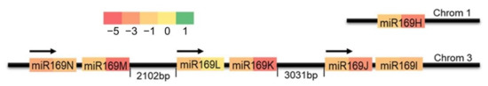 Differentially expressed subgroup miR169H/I/J/K/L/M/N in cid3cid4. Relative location of genes coding miR169H in A. thaliana chromosome 1 and miR169I/J, miR169K/L, and miR169M/N in chromosome 3; the direction of transcription is depicted by arrows. Differential expressed values are presented as described in Figure 4. Gene code values of the differentially expressed genes are displayed in Supplementary Table S1.
